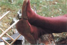 Наличие лошади и неплохое жалованье позволяло некоторым солдатам обзаводиться модными ботинками с длинными носами. Такие башмаки вошли в моду при Ричарде II (1377-1399). а затем снова приобрели популярность во второй половине XV в. По понятным причинам в походах такие башмаки носили только самые эксцентричные модники при езде верхом или в спокойной обстановке полевою лагеря. Поле боя быстро учило воинов, какие башмаки удобные, а какие нет. Высокие сапоги подходили для верховой езды. Такие сапоги могли быть как грубыми с прямоугольным носком, так и элегантными с округлым носком и облегающим голенищем. Польем сапога делался достаточно высоким, чтобы можно было просунуть ногу, затем излишек кожи собирался в складку и фиксировался крючком или ремнем с пряжкой. Для пошива сапог использовалась очень мягкая кожа, иногда голенище походило на чулок, так плотно оно облегало ногу. Однако технология выделки кожи утрачена, что весьма затрудняет адекватную реконструкцию. Очень длинные голенища могли доходить до середины бедра. При этом верх голенища подвязывался к поясу. Часто в голенище имелась подкладка, что значительно удорожало изделие.