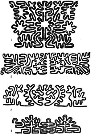 1 –3 Рожаницы и птицы в северорусском кружеве. XIX в. В наши дни идеи Ф.И.Буслаева вновь вернул к жизни академик Б.А.Рыбаков в своей книге «Язычество древних славян», где он убедительно доказал, что восточные славяне – наши предки, задолго до введения христианства имели свой очень сложный и развитый культ Бога дождей, гроз, влаги вообще, плодородия, кровного родства и Творца Вселенной – Рода, аналогичного по своим функциям христианскому БогуТворцу Саваофу. Две богини Рожаницы охраняли семейный очаг, защищали женщин, дарили им потомство и помогали в родах. Б.А.Рыбаков считает, что культ Рожаниц действительно существовал долгое время на севере Руси, не искорененный и не уничтоженный христианством [343]. Изображения Рожаниц можно встретить на концах полотенец, на подзорах свадебных простыней и, конечно, на северо-русских женских головных уборах. Род и Рожаницы выступают здесь в качестве неких изначальных сущностей – первопредков людей, т. н. тотемов. Н.А.Криничная отмечает, что: «Поскольку головной убор был неким средоточием тотемистической сущности индивида, ему, судя по мифам и преданиям, придавалось важное значение при исполнении обряда инициации (т.е. перехода в другой возрастной и социальный статус – С.Ж.)... Можно предполагать, что головной убор маркируется как знак приобщения индивида к тотемному предку (тотему)» [344]. Она считает, что миф о тотемном предке формируется уже в период раннеродового общества, примерно 30–40 тысяч лет назад [345], и что этот образ «является порождением определенных социально-экономических условий, характерных для общинно-родовой организации, когда личность полностью отсутствует или, вернее, понимается как часть целого, не выделяющаяся никакими признаками индивидуальности, не обладающая никакой спецификой, когда понятия человека еще не было. В этих условиях индивид оказывается «слитым» не только с определенной ограниченной общностью, но и с самой природой. Персонификацией подобной общности и невыделенности как раз и является образ мифического предка – родоначальника, во внешнем облике которого в различных неустойчивых пропорциях сочетаются зоо-, фито- и антропоморфные признаки. Данный персонаж оказался тем мифологическим обобщением, тем воплощением древнейшей типизации, которые в той или иной степени реализовались в последующем фольклорном процессе» [346]. И здесь, вслед за Н.А.Криничной, хотелось бы повторить слова выдающегося исследователя О.М.Фрейденберг: «Система новой культуры сознания складывается на основании тех самых принципов построения, которые были и раньше в прежних системах. Тотемизм – это увертюра к будущим культурам, это пролог будущей человеческой «Трагедии». Он сразу все открывает и прячется, как угасшая комета. Потом культура начинает свой путь сызнова, варьируя во времени и каузальности все сказанное раньше» [347]. На головках, т.е. на верхних затылочных частях северодвинских и тарногских повойников, выполненных из штофа или бархата, как правило вишневого, малинового или алого цвета, изображаются вышитые золотыми или серебряными нитями странные существа. Как правило, каждое из них представлено в характерной распластанной «лягушачьей» позе, типичной позе рожающей женщины. Под основной, центральной фигурой, на руках которой, очень похожих на звериные лапы, сидят птицы или зм