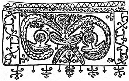 Женский повойник (кокошник, сборник, борушку, сороку и т. д.) одевали на голову молодой на свадьбе – «делали из девушки молодушку». Одну девичью косу расплетали, долго и тщательно расчесывали волосы, делили их на прямой пробор и заплетали две женские косы, которые укладывали вокруг гловы. На эту прическу одевали женский повойник, из-под которого не должна была выглядывать ни одна волосинка. На северорусских женских головных уборах, расшитых золотными нитями, жемчугом, стеклярусом, бисером и цветными камнями, как и в браном ткачестве и вышивке рубах, передников и поясов, сохранилось огромное количество изобразительных мотивов и образов, которые сложились в недрах многотысячелетней языческой древности. Особая значимость женского головного убора в русской народной традиции отмечалась неоднократно, достаточно назвать широко известные работы Н.И.Гаген-Торн [339], Г.С.Масловой [340] и других исследователей. Специфическая связь женского головного убора с символикой плодородия была отмечена в вышедшей в свет в 1985 году книге Д.М.Балашова, Ю.И.Марченко и Н.И.Калмыковой «Русская свадьба», посвященной различным свадебным обрядам, бытовавшим до недавнего времени в Тарногском районе Вологодской области. Авторы книги пишут: «Очень древний обычай, с элементами магии, рассказали нам в Илезе и повторили в Нижнем Спасе (то есть можно предполагать, что обычай когда-то был известен по всей Кокшеньге). Перед отъездом свата или сватов из дому для успеха дела их хлестали или забрасывали женскими гловными уборами» [341]. В этом обычае ярко выражена магическая сущность женского повойника как священного предмета, приносящего плодородие, счастье, удачу. (В некоторых местах Русского Севера мать, заговаривая грыжу у грудного ребенка, шептала заговор через повойник). Столь важный элемент одежды украшался на Русском Севере с особой тщательностью. Разумеется, речь идет о праздничных, парадных головных уборах, отличавшихся богатством декора и зачастую огромной стоимостью, что обеспечивало их бережное хранение и передачу из поколения в поколение. Естественно, не каждая крестьянка могла позволить себе роскошь иметь повойник, стоимость которого равнялась стоимости двух дойных коров или лошади. Говоря об образах, которые запечетлены на вологодских праздничных женских кокошниках, мы должны обратиться к тому миру языческих представлений, в котором жили наши предки задолго до введения христианства на Руси. Прежде всего это представления о верховных божествах Вселенной – Роде и Рожаницах. Вопрос о наличии у восточных славян в древности культа Верховного Бога Рода и сопровождающих его богинь плодородия Рожаниц был поставлен выдающимся русским фольклористом Ф.И.Буслаевым еще в середине XIX века, а первое упоминание об этих божествах относится к раннему средневековью. Так, они упоминаются в «Слове» древнерусского книжника св. Григория в составе Паисиева сборника XIV в. Кирилло-Белозерского монастыря. Ф.И.Буслаев считал, что на стадии пастушеского и земледельческого периода своей истории древние славяне, или их предки, поклонялись Волосу и Перуну. Но ранее, в более древние времена, они имели других богов. Память об этих далеких временах сохранилась в имени бога Сварога (на санскрите «сварга» – небо, передвигающийся в небе, ведущий на небо, небесный, название одног