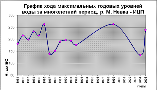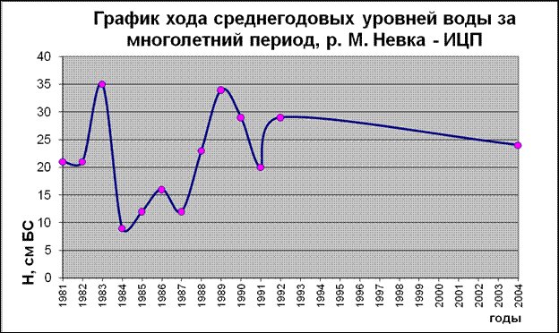 На рис. 3 представлен график хода среднегодовых уровней воды по данному посту в период с 1981 по 2004 гг.