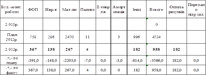 По будівельно-монтажних роботах витрати склали 958тис.грн., що нижче плану та вище факту звітного періоду минулого року відповідно на 3566тис.грн та 958тис.грн. Зменшення витрат відбулося за рахунок зменшення обсягів будівельно-монтажних робіт для сторонніх підприємств, у зв’зяку із збільшенням обсягів будівельних та ремонтних робіт для підприємств залізниці (реконструкція вокзалу ст.Слав’янськ та вокзалу ст.Артемівськ).