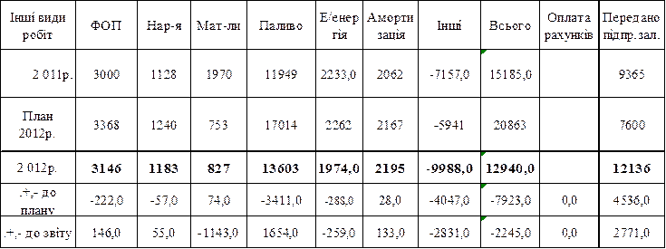 Витрати по інших видах робіт склали 12940тис.грн. (зокрема, стороннім організаціям – 6778тис.грн., власне виробництво – 6162тис.грн), що нижче плану та факту відповідного періоду минулого року відповідно на 7923тис.грн. та 2245тис.грн. за рахунок: - економії до плану по елементу «ФОП та Нарахування» на 279тис.грн. за рахунок зменшення обсягів ремонтних робіт для сторонніх підприємств та більше проти минулого року на 201тис.грн. за рахунок збільшення посадових окладів; - «Матеріали» більше плану на 74тис.грн. за рахунок збільшення вартості матеріалів, але нижче минулого року на 1143тис.грн. за рахунок зменшення обсягів ремонтних робіт для сторонніх підприємств; - «Паливо» на 3411тис.грн. нижче плану за рахунок зменшення витрат вугілля та газу через підвищення температури повітря у березні, жовтні, листопаді, та вище факту відповідного періоду минулого року на 1654тис.грн. та за рахунок придбання природного газу від постачальників по цінам за 1000м3 (2011р. -1968,7грн. за 1000м3, 2012р. – 3051,9грн. за 1000м3) та із збільшенням опалювальної площі; - «Електроенергія» на 288тис.грн. та 254,7тис.кВт нижче плану та меньше факту відповідного періоду минулого року на 259тис.грн. та 534,4тис.кВт, у зв’язку з з реконструкцією котельні 438 кварталу, підвищенням температури повітря у листопаді 2012р.; - «Амортизація» більше плану та факту звітного періоду минулого року відповідно на 28тис.грн. та 133тис.грн. за рахунок дооцінки основних засобів; - по елементу «Інші» нижче до плану та факту звітного періоду минулого року відповідно на 4047тис.грн. та 2831тис.грн. склалися у зв'язку зі збільшенням витрат з надання послуг з теплопостачання для підприємств залізниці, використання машин і механізмів для обслугованная котелень, а саме проведення пусконаладних робіт, ремонту внутрішньої системи опалення та збільшення обсягу переданих послуг для підприємств залізниці.