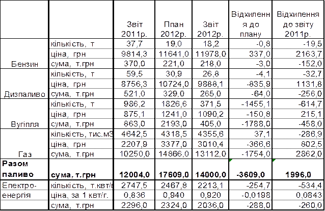 За 2012 ріквитрати по елементу «Паливо» склалися в сумі 14000тис.грн. економія до плану склало 3609тис.грн., зокрема: - дизпаливо у кількісному та вартісному виразі на 4,1т та 64тис.грн. відповідно за рахунок зменшення використання автотракторної техніки, що працює на дизельному паливі; - бензин у кількісному та вартісному виразі на 0,8т та 3тис.грн. відповідно за рахунок зменшення використання автотехніки, що працює на бензині; - газ - у кількісному виразі вище на 37,1тис.м3 у зв’язку з збільшенням опалювальної площі, а саме ПЧ-9, транзитний вокзал та переводу котельні 93 кварталу з вугільної на газову. Зменьшення витрат у вартісному виразі нижче на 1754тис.грн. у зв’язку із використанням комунального газу; - вугілля - у кількісному та вартісному виразі менше плану на 1455,1тис.т та 1788тис.грн. відповідно у зв’язку із переводом котельні 93 кварталу з вугільної на газову; Витрати електроенергії нижче плану в кількісному та вартісному виразі на 254,7тис.кВт та 288тис.грн. за рахунок зменшення обсягів використанням засобів малої механізації (дрілей, перфораторів) та у зв’язку з реконструкцією котельні 438 кварталу.