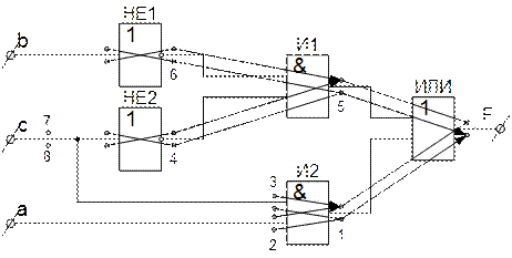 Рассмотрим построение проверяющего теста комбинационной схемы относительно константных неисправностей. Для этого по заданной ФАЛ вычерчиваем схему с указанием всех логических элементов и связей между ними. Комбинационная схема реализует функцию F = При этом на схеме укажем компоненты и все неисправности компонент. Под компонентами понимают входы и выходы элементов, и входы схемы. Входы схемы, выходы элементов, если они соединены с входом только одного элемента, рассматривают как одну компоненту. Если в схеме имеется точка разветвления, то в качестве компонент считаются как точки разветвления, так и все ветви разветвления. Для каждой компоненты наносим две константные неисправности К→1, К→0. Данная схема имеет 10 компонент и 20 неисправностей. На каждый логический элемент наносим графы эквивалентных неисправностей и отношения импликации между неисправностями, т.е. устанавливаем отношения между всеми неисправностями схемы. Затем нумеруем неисправности, при этом среди эквивалентных неисправностей нумеруем только одну, ближе всех расположенную к выходу. Все неисправности, к которым направлены дуги, не нумеруют, а если дуга направлена к одной из эквивалентных неисправностей, то ни одну из них не нумеруют. В результате выполнения данной операции сокращаем список неисправностей, которые рассматриваем при построении теста. В данной схеме пронумеровано 8 неисправностей, в то время как исходное множество содержит 20 неисправностей.