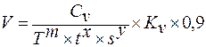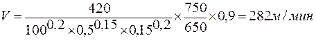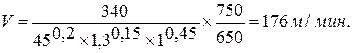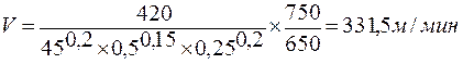 Коэффициент Cv=420; показатели степени m=0,2; x=0,15; y=0,2 для материала режущей части резца твердого сплава Т15К6 по табл. 17[6]. Т=45 мин – стойкость инструмента при одноинструментальной обработке.