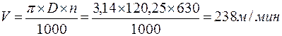 Растачивание внутренней канавки Æ 120,25. t=2,5мм; По табл. 14 [6] выбираем подачу s=0,33´Ks=0,33´0,45=0,15 мм/об, так как обрабатываемая сталь 40ХЛ с sв=650 Мпа. Рассчитываем скорость резания по формуле: