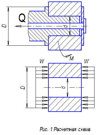 9.2 Силовой расчет В силовом расчете нам необходимо определить зажимное усилие Q, обеспечивающее удержание детали от проворачивания в результате действия крутящего момента М, возникающего от силы резания Pz. А также необходимо рассчитать параметры пневмоцилиндра. Составляем расчетную схему. Упрощенно схему зажима детали можно представить в виде показанном на рис. 1.