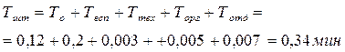 Время на установку и снятие детали, закрепление её и открепление: Т Время на приемы управления: включить и выключить станок - 0,015 мин; подвести или отвести резец - 0,010 мин. Т Время на измерение детали: Т Определяем вспомогательное время: Т В крупносерийном производстве время на техническое обслуживание и время организационного обслуживания по отдельности не определяются. В нормативах даётся сумма этих двух составляющих в процентах от оперативного времени. Оперативное время: Т Т Определяем время на обслуживание рабочего места и отдых: Ттех = 0,12·2,5/120 = 0,003 мин. Торг = Топер∙1,7/100% = 0,32∙1,7/100% = 0,005 мин Тотд = Топер∙6/100% = 0,12∙6/100% = 0,007 мин Определяем норму штучного времени: