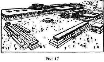 Теотиуакан был основан в первые столетия христианской эры, но постепенно их оценки сдвигались назад. Раскопки показали, что культовый центр города еще в 200 году до нашей эры занимал площадь в 4,5 квадратные мили. В 50-х годах двадцатого века главный археолог М. Коваррубиас был вынужден признать, что радиоуглеродный анализ оценивает возраст этого места «почти невероятной датой 900 года до нашей эры» («Indian Art of Mexico and Central America»). На самом деле последующие радиоуглеродные тесты указали на 1474 год до нашей эры (с небольшой погрешностью). В настоящее время считается, что примерно в 1400 году до нашей эры ольмеки, которые могли построить монументальные сооружения Теотиуакана, основали огромные «культовые» центры по всей Мексике. Теотиуакан прошел через несколько фаз в своем развитии, и его пирамиды хранят следы более древних внутренних структур. Некоторые ученые читают по этим руинам историю, которая могла начаться 6000 лет назад, в четвертом тысячелетии до нашей эры. Такая датировка совпадает с легендами ацтеков, в которых говорится, что в этом месте во время четвертого Солнца жили боги. Затем, после того как примерно в 1400 году до нашей эры наступил день Тьмы, были построены гигантские пирамиды в их нынешнем виде. В северной части культового центра возвышается Пирамида Луны, по обе стороны которой расположены вспомогательные постройки меньшего размера, а перед ней — громадная площадь. Отсюда на юг ведет широкая аллея — так далеко, насколько хватает глаз. Вдоль нее располагаются низкие алтари, храмы и другие строения, которые считаются гробницами; вследствие этого аллея получила название Аллеи Мертвых. Через 2000 футов Аллея Мертвых приводит нас к Пирамиде Солнца, расположенной к востоку от нее (рис. 11), позади площади, а также группы алтарей и других строений. За Пирамидой Солнца, пройдя еще 3000 футов к югу, мы попадаем в Цитадель, четырехугольник, восточную часть которого образует третья пирамида Теотиуакана — Пирамида Кетцалькоатля. Теперь нам известно, что напротив Цитадели на противоположной стороне Аллеи Мертвых находился похожий четырехугольник, служивший, в основном, административным и торговым центром. Аллея шла дальше на юг. В результате работ по топографической съемке Теотиуакана, которыми в 60-х годах двадцатого века руководил Рене Миллон, выяснилось, что Аллея Мертвых протянулась с севера на юг более чём на пять миль — такой длинной взлетной полосы нет ни у одного современного аэропорта. Несмотря на вызывающую изумление длину, аллея является ровной, как стрела, и это непростая задача для строителей любой эпохи. Ось восток-запад, перпендикулярная протянувшейся с севера на юг Аллее Мертвых, ведет на восток от Цитадели и на запад от административного комплекса. Участники проекта по топографической съемке Тиотиуакана обнаружили к югу от Пирамиды Солнца вырезанный в скалах ориентировочный знак в форме креста внутри двух концентрических окружностей; похожий знак был также найден в двух милях к западу, на склоне горы. Линия, проведенная между этими знаками, в точности совпадает с осью восток-запад, а перекладины крестов указывают на север и юг. Исследователи пришли к выводу, что найденные знаки использовались при исходной планировке города, однако они не предложили никакой гипотезы, позволяющей объяснить, какими средствами пользо