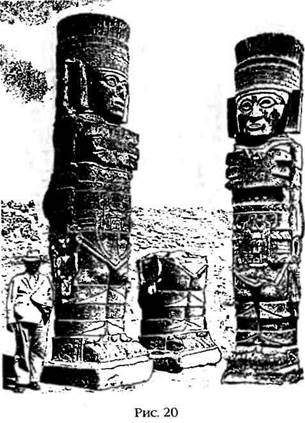 Когда в 1940 году под руководством Хорхе Р. Акосты начались методичные и целенаправленные раскопки, внимание археологов сосредоточилось на Большой Пирамиде, фасад которой был обращен к Большому Алтарю, и которая явно служила для астрономических наблюдений. В то время ученые недоумевали, почему местные индейцы называли этот заброшенный холм El Tesoro, то есть «сокровище», но после начала раскопок были найдены несколько золотых предметов, и рабочие отказались продолжать работу, утверждая, что пирамида стоит на «поле из золота». «Неизвестно, что это было, суеверие или факт, — писал Акоста, — но в результате работы были остановлены и больше не возобновлялись». После этого раскопки сосредоточились на меньшей по размеру пирамиде, которую сначала назвали Пирамидой Луны, затем Пирамидой «В», а затем Пирамидой Кетцалькоатля. Последнее обусловлено, в основном, длинным местным названием холма, которое переводится как «Господин Утренней Звезды» — вероятно, это один из эпитетов Кетцалькоатля, — а также остатками украшавших ступени пирамиды цветных фресок и барельефов, в которых преобладал мотив Пернатого Змея. Археологи также убеждены, что две круглые каменные колонны, от которых сохранилось несколько фрагментов, были украшены резьбой с изображением Пернатого Змея и стояли у входа в храм на вершине пирамиды. Самая ценная археологическая находка была сделана после того, как археологи Акосты поняли, что северная часть пирамиды была потревожена еще до прихода испанцев. По центру этой грани спускалось нечто вроде пандуса, который заменил ступени. Произведя раскопки в этом месте, ученые обнаружили, что в пирамиде была прорезана настоящая траншея, достигающая ее внутренних помещений. Она была использована для захоронения огромного количества каменных изваяний. Когда их извлекли на поверхность, установили и идентифицировали фрагменты, стало ясно, что это части двух круглых привратных колонн, четырех квадратных колон, которые предположительно поддерживали крышу храма, и четырех колоссальных статуй высотой более пятнадцати футов, получивших название Атланты (рис. 20). Считается, что эти гигантские человеческие фигуры тоже поддерживали крышу храма, и поэтому по окончании реставрационных работ их вернули на вершину пирамиды.