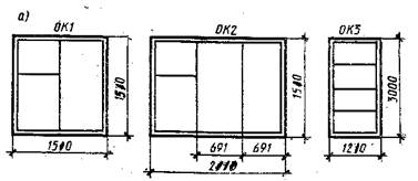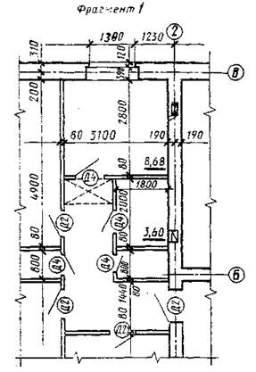Первую линию размеров наносят на расстоянии 20 мм от контура стены, последующие — на расстоянии 7 мм друг от друга. Координационным осям присваивают марку, которую помещают на конце оси в кружке диаметром 8 мм. Размер шрифта для обозначения марок принимают 5. Вертикальные оси обозначают слева направо арабскими цифрами, горизонтальные оси — снизу вверх русскими заглавными буквами в алфавитном порядке. Размеры оконных (OKI, ОК2, ОКЗ) и дверных (Д1, Д2, ДЗ, Д4) проемов принять по рис. 34 а, б. На схематизированном плане здания (см. рис. 32) буквами обозначены следующие помещения: К — кухня, В — ванная, Т — туалет, Ш — встроенный шкаф. Толщину перегородок следует назначать равной 80... 100 мм. Пример оформления фрагмента плана показан на рис. 35. План здания вычерчивать основной сплошной линией толщиной 0,4 мм, а капитальные стены, попавшие в разрез,— 0,8 мм. Сечение стен, выполняемых из материала, являющегося для здания основным не заштриховывают.