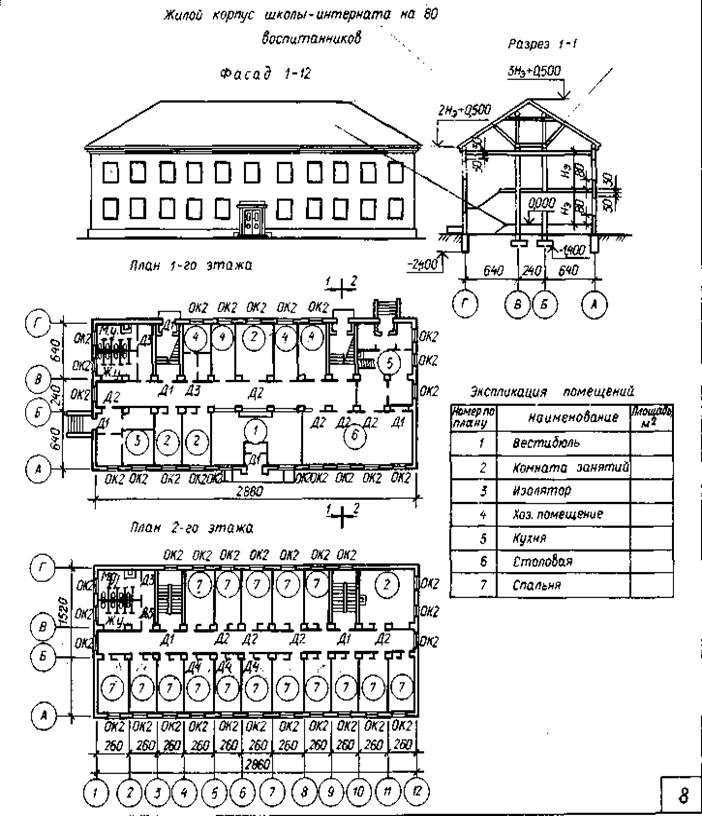 Работа предоставляется на рецензию в полном объеме. Сданные на рецензию отдельные листы не рецензируются и не засчитываются. Работа, выполненная не по своему варианту, не рецензируется. Незачтенную контрольную работу нужно исправить или переделать в зависимости от указаний преподавателя и предоставить на рецензию вторично. Стирать замечания преподавателя запрещается. Контрольную работу нужно сдавать на рецензию сложенной до формата А4 и подшитой в папку-скоросшиватель. Первый лист контрольной работы - титульный лист должен быть выполнен чертежным шрифтом или набранный на компьютере. В задании даны схематические чертежи планов этажей, фасада и разрезов здания, дана экспликация помещений, указаны типы оконных и дверных проемов. В таблице указан материал и толщина наружных стен, высота этажа и положение секущей плоскости для вычерчивания разрезов. Используя эти данные, требуется на листе в масштабе 1: 100 выполнить план первого и второго этажа, фасад и разрез, толщину внутренних стен принять 380, перегородок 120. Проставить все наружные и внутренние размеры помещений, проставить площади помещений. Все эти чертежи нужно расположить в проекционной связи. Пример компановки графической работы приведен на рисунке ниже. Вариант берется по последней цифре шифра. ОК-1 1800х2100, ОК-2 1600х2100, ОК-3 1400х2100, ОК-4 1200х2100, ОК-5 1000х2100, ОК-6 1600х2500, Д-1 1400х2100, Д-2 900х2000,Д-3 900х2000, Д-4 700х1800, Д-5 700х1800 Варианты заданий