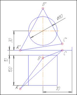 Задание 5. Сечение поверхности плоскостью. Построить проекции и истинную величину сечения поверхности плоскостью, заданной треугольником ABC и построить развертку поверхности с указанием линии сечения.