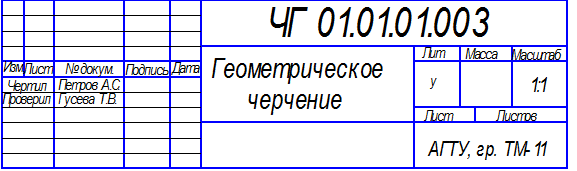Основная надпись чертежа. ГОСТ 2.104—68 устанавливает формы, размеры, порядок заполнения основных надписей и дополнительных граф к ним в конструкторских документах. Установлены две формы основной надписи: форма 1 — для чертежей и схем; форма 2 — для текстовых документов. Расположение основной надписи чертежа показано на рис. 1.1.Hа листах формата А4 основную надпись по ГОСТ 2.301— 68 располагают вдоль короткой стороны листа. Основная надпись для учебных чертежей выполняется по форме 1 (рис. 1.2а). Графа 1 — Наименование чертежа. Графа 2 — Обозначение чертежа, состоящее из индекса раздела курса черчения, например ЧГ — черчение геометрическое, ЧП — черчение проекционное и т. д.; справа от индекса ставится номер курса, семестра, порядковый номер задания, номер варианта, например, ЧГ 01.01.01.003 Графа 4— Литера чертежа «у» (учебный чертеж). Графа 9— Название учебного заведения и шифр группы. Графа 10— Характер работы, выполненной лицом, подписавшим чертеж (чертил, проверил).