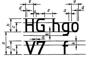 Рис. 1.4 Чертежи и прочие конструкторские документы всех отраслей промышленности и строительства содержат необходимые надписи: название изделий, размеры, данные о материале, обработке деталей, спецификации и другие надписи.Если надписи на чертежах сделаны небрежно, то при изготовлении деталей по таким чертежам возможны ошибки.ГОСТ 2.304—81 (устанавливает чертежные шрифты, наносимые на чертежи и другие технические документы всех отраслей промышленности и строительства. Размер шрифта h - величина, определенная высотой прописных букв в миллиметрах. Высота прописных букв h измеряется перпендикулярно к основанию строки. Высота строчных букв с определяется из отношения их высоты (без отростков k) к размеру шрифта h, например, с = 7/10 h (рис. 1.5 и 1.6). Ширина буквы g - ширина буквы определяется по отношению к размеру шрифта h, например, g = 6/10 h, или по отношению к толщине линии шрифта d, например, g = 6 d. Толщина линии шрифта d - толщина, определяемая в зависимости от типа и высоты шрифта.
