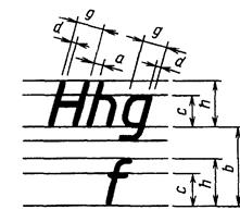 Рис. 1.7 Устанавливаются следующие типы шрифта: тип А без наклона (d = 1/14 h) с параметрами, приведенными в табл. 2; тип А с наклоном около 75° (d = 1/14 h) с параметрами, приведенными в табл. 2; тип Б без наклона (d = 1/10 h) с параметрами, приведенными в табл. 3; тип Б с наклоном около 75° (d = 1/10 h) с параметрами, приведенными в табл. 3. Таблица 2 Шрифт типа А (d = h /14)
