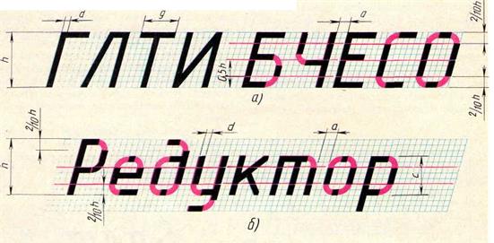Рис. 1.16 Для надписей чертежным шрифтом выполняется вспомогательная сетка сплошными тонкими линиями. При этом необходимо учесть разную ширину букв (рис. 1.17; буквы Ш, X, Ю). Расстояние между некоторыми буквами, например, Г и А (и в аналогичных сочетаниях букв) уменьшается до размера, равного толщине линии букв (рис. 1.18; буквы Г и Л). Прописные буквы по начертанию условно делят на три группы. При написании букв первой группы, например, Ш, Ц, Г, И нетребуются вспомогательные линии (рис. 1.17; буквы Ш, Ц, X). Для написания второй группы посередине сетки проводят линию, над которой или под которой располагаются средние элементы букв, например букв Э, Ч, Ю, Б (рис. 1.17, 1.18). Для написания букв третьей группы - две линии, которые находятся на расстоянии 3/14 h (для шрифта типа А) от верхней и нижней линии, ограничивающие скругление букв (рис. 1.17; буквы Э, Ю). В шрифте типа Б эти две линии расположены на расстоянии 2/10 h (рис. 1.18, а). Это нужно учитывать и при выполнении строчных букв (рис. 1.18, б).