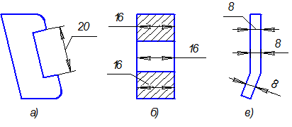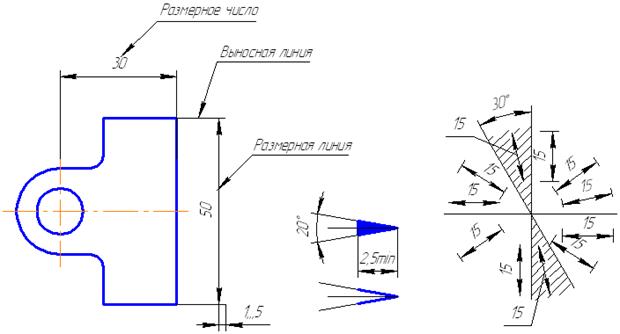 Рис. 1.23 Если размерная линия составляет с вертикальной линией угол менее 300. то размерное число наносят на полке линии-выноски (рис. 1.24 а). Если для нанесения размерного числа недостаточно места над размерной линией, то размеры наносят, как показано на рис. 1.24 б; если недостаточно места для нанесения стрелок, то их наносят, как показано на рис. 1.24 в.