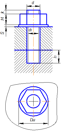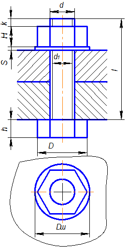 Упрощенное изображение резьбовых соединений. На сборочных чертежах резьбовые соединения изображаются упрощенно (ГОТС 2.315-68), по приведенным размерам: D = 2d S = 1,5d Dш = 2,2d k = 0,3d H = 0,8d d1 = 0,85d h = 0,7d Упрощенные изображения резьбовых соединений имеют следующие особенности: резьбу условно показывают по всей длине стержней болта, шпильки или винта; фаски на крепежных деталях не изображают. Не показывают зазор между болтом (шпилькой) и соединяемыми деталями. На виде сверху не показывают резьбу. На рис. 4.30 показаны упрощенные изображения болтового и шпилечного соединений.