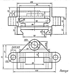 Третья часть «Проекционное черчение и аксонометрические проекции» Содержание третьей части: 1. По двум заданным видам детали построить третий вид. 2. На листе выполненных видов построить необходимые разрезы, по возможности соединяя часть вида и часть разреза, или заменяя виды разрезами. 3. Проставить размеры, обозначить при необходимости разрезы. 4. Выполнить прямоугольную изометрию детали [10]. Нанести аксонометрические оси, вспомогательные построения оставить в тонких линиях. Задание выполняется по вариантам на формате А3 (297х420), основная надпись по форме 1 Гост 2.104-68. Варианты заданий выбираются аналогично. В графе “Обозначение” основной надписи подписать ПЧ1 XX.02 шрифтом № 10, где ПЧ1 - тема задания (проекционное черчение), XX - номер варианта задания, 02 – номер работы. В графе “Наименование” основной надписи подписать наименование детали. Пример выполнения задания приведен в Приложении 1.