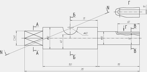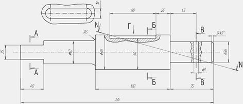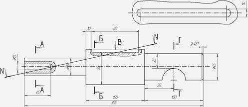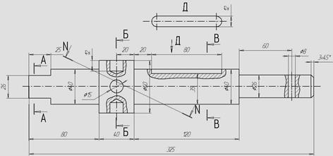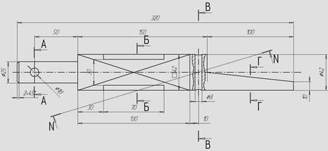 Четвертая часть «Построение сечений вала» Выполнить чертеж вала: 1. Перечертить имеющиеся изображения вала. 2. Выполнить вынесеннные сечения в местах, указанных буквами, так, чтобы секущие плоскости проходили через различные элементы детали (отверстия, пазы и т.п.).(наклонное сечение строить не надо) 3. Проставить размеры. 4. Обозначить при необходимости сечения.