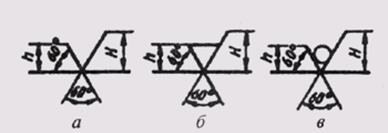На рис. 276 изображены знаки, которые применяются в обозначении шероховатости. Размер h берется равным высоте размерных чисел на чертеже, а размер Н равен (1, 5,... 3)h. Знак на рис. 64, а применяют для обозначения шероховатости поверхности, вид обработки которой конструктором не задается. Знак на рис. 64, б обозначает шероховатость поверхности, образуемой удалением слоя металла (точение, фрезерование, сверление и т. д.). Шероховатость поверхности в состоянии поставки (прокат, поковка, литье и др.) и не обрабатываемой по данному чертежу обозначается знаком, показанным на рис. 65, в.