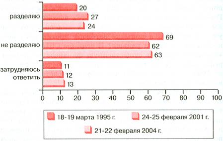 Главным делом М. С. Горбачева была глубокая демократизация страны. Именно он отменил цензуру, ввел конкурентные выборы, сделал реальными существовавшие ранее лишь на бумаге права и свободы граждан. Не будет преувеличением сказать, что М. С. Горбачев дал советскому народу свободу. Цена оказалась велика. Общественное мнение современной России о М. С. Горбачеве. Приведем данные опроса Фонда «Общественное мнение» (26 февраля 2004 г.; опрошено 1500 человек, статистическая погрешность не выше 3,6%): На Западе многие считают М. С. Горбачева выдающимся политическим деятелем XX в. А вы лично разделяете или не разделяете такое мнение о М. С. Горбачеве?