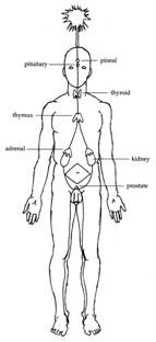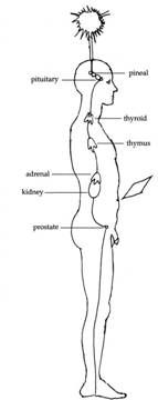 15. Канал мужской энергии и творческий алмаз, вид спереди 6. Направьте золотой солнечный свет из своего гипофиза в щитовидную железу. Когда ваша щитовидная железа будет переполнена, переходите к следующему шагу. Внимание: энергия проходит через вашу шишковидную железу к вашему гипофизу и будет продолжать это делать на протяжении всего очищающего упражнения. 7. Визулизируйте или задайте намерение, что этот золотой солнечный поток продолжает течь вниз к вашей вилочковой железе, расположенной в центре вашей груди. На этот раз не переполняйте вилочковую железу. Просто продолжайте направлять солнечный свет через оставшуюся часть канала к вашим надпочечникам, затем к почкам и, наконец, к простате. 8. Посидите минимум пять-десять минут, позволяя золотому солнечному свету течь через весь ваш канал мужской энергии. Задайте этому процессу «автоматическиий режим» и переходите к следующему шагу. 9. Присоедините заземляющуий шнур к основанию резервуара вашей мужской энергии. Этот заземляющий шнур должен идти в Землю только на один или два фута. 10. Представьте выключатель «вкл./выкл.» на резервуаре и включите его. Вначале цвета могут быть загрязенными или пестрыми. Сидите, направляя поток золотого солнечного света и сохраняя заземление вашего резервуара мужской энергии, пока цвет в вашем резервуаре не станет единым цветом. Этот цвет и будет цветом вашей мужской энергии. 11.Остановите движение потока золотого света и переходите к следующему упражнению. Далее приводится упражнение, предназначенное для того, чтобы направить вашу творческую мужскую энергию на поддержание самого себя. 1. Наклоните свой резервуар мужской энергии вниз, как показано на иллюстрации 14, стр. 151. Чтобы усилить этот опыт физически поместите свои руки вокруг резервуара. 2. Направьте энергию, находящуюся в этом резервуаре так, чтобы она текла в область вашей простаты и в ваши каналы мужской энергии. Ваша мужская энергия потечет через весь канал, пока не достигнет вашей шишковидной железы, с этого момента энергия начнет циклично двигаться вниз через цифру 8 к вашему гипофизу, а затем обратно через ваши каналы, пока не достигнет вашей простаты. Продолжайте держать свой резервуар наклоненным вниз, чтобы он наполнял ваш канал мужской энергии. 3. Когда ваша мужская энергия потечет обратно из вашей простаты, пройдя полный круг, уберите заземляющий шунр только от простаты. Оставьте тот шнур, который соединен с резервуаром. 4. Начните направлять энергию, которая переполняет ваш канал мужской энергии в области простаты, чтобы распространить ее во вне по всему вашему телу. Когда энергия коснется вашей кожи вокруг всего тела, представьте, что вы вдыхаете энергию через свою кожу. Продолжайте это делать столько, сколько необходимо, пока не почувствуете, что вы наполнились своей мужской энергией. 5. Помните, что эта замечательная энергия, которую вы чувствуете – это то, что другие чувствуют, когда получают ее от вас. Вы можете закрыть поток энергии и вернуть свой резервуар в его нормальное положение (он будет отвернут от вашего тела). Решите вы оставить заземляющий шунр на своем резервуаре или нет – это остается на ваше усмотрение. Поэкспериментируйте, оставляя, а затем удаляя его, и решите, что для вас более предпочтительно (запись). Это упражнение можно делать так часто, как вы пожелае