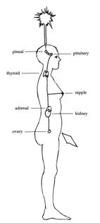 Управление Мужской Энергией (только для мужчин) Первое упраждение – это предпосылка к тому, чтобы по-настоящему управлять своей мужской энергией. Оно используется для того, чтобы прочистить свои каналы мужской энергии и свой резервуар мужской творческой энергии. На рисунке 13, стр. 150 вы увидите, что канал мужской энергии начинается в вашей шишковидной железе и затем проходит череж фигуру 8, или символ бесконечности, к вашему гипофизу и обратно. Цифра 8 используется для того, чтобы создать обратный поток не только между этими двумя железами, но и между вашей шишковидной железой и остальным каналом. Ваши каналы мужской энергии расширяются от вашего гипофиза вниз через вашу щитовидную железу в вашем горле, затем через вилочковую железу, расположенную в вашей сердечной чакре и вниз через ваши надпочечники и почки к вашей простате. Ваш резервуар мужской творческой энергии показан на иллюстрациях на страницах 151-152. Этот резервуар является контейнером для вашей мужсной порождающей, творческой энергии. Очищение и активация этого резервуара будет последним этапом этого упражнения. Процесс очищения вашего канала мужской энергии выглядит следующим образом: 1. Создайте для себя маленький заземляющий шнур от своей простаты до центра Земли. Если вам нужен новый, больший заземлюящий шнур в вашей первой (или корневой) чакре, создайте его для себя. 2. Проверьте цвета на границе вашей ауры и размер ауры и произведите необходимую регулировку. 3. Визуализируйте солнце на высоте примерно восемндцать дюймов над вашей головой. 4. Начинайте визуализировать или при помощи намерения заставьте потоки солнечного света проходить через вашу коронную чакру и наполнять вашу шишковидную железу до ее переполнения. (См. иллюстрацию 13 на стр. 150). Когда ваша шишковидная железа будет переполнена, переходите к следующему шагу. 5. Теперь направьте золотой солнечный свет через цифру 8 и к своему гипофизу. Когда ваш гипофиз будет переполнен и начнет возвращать энергию обратно вашей шишковидной железе, переходите к следующему шагу.