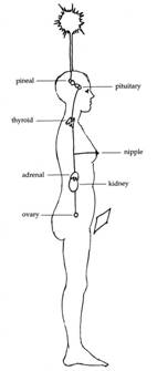 Ваш резервуар женской творческой энергии показан на иллюстрации 17 на странице 156. Этот резервуар является контейнером для вашей женской порождающей творческой энергии. Очищение и активация этого резервуара будет последним этапом этого упражнения перед тем, как действительно направить вашу творческую женскую энергию. Процесс очищения вашего канала женской энергии выглядит следующим образом: 1. Создайте для себя два маленьких заземляющих шнура от каждого из яичников до центра Земли. Если вам нужен новый, больший заземлюящий шнур в вашей второй чакре, создайте его для себя. 2. Проверьте цвета на границе вашей ауры и размер ауры и произведите необходимую регулировку. 3. Визуализируйте солнце на высоте примерно восемндцать дюймов над вашей головой. 4. Начинайте визуализировать или при помощи намерения заставьте потоки солнечного света проходить через вашу коронную чакру и наполнять вашу шишковидную железу до ее переполнения. (См. иллюстрацию 16 на стр. 156). Когда ваша шишковидная железа будет переполнена, переходите к следующему шагу. 5. Теперь направьте золотой солнечный свет через цифру 8 и к своему гипофизу. Когда ваш гипофиз будет переполнен и начнет возвращать энергию обратно вашей шишковидной железе, переходите к следующему шагу. 6. Направьте золотой солнечный свет из своего гипофиза в щитовидную железу. Когда ваша щитовидная железа будет переполнена, переходите к следующему шагу.Внимание: Энергия проходит через вашу шишковидную железу к вашему гипофизу и будет продолжать это делать на протяжении всего очищающего упражнения. 7. Визулизируйте или задайте намерение, что этот золотой солнечный поток продолжает течь вниз по двум каналам позади ваших грудей. Выпускайте переполняющий поток энергии через соски в течение одной-двух минут перед тем, как двигаться дальше. .8. Продолжайте направлять солнечный свет через оставшуюся часть канала к вашим надпочечникам, затем к почкам и, наконец, в яичники. 9. Посидите минимум пять-десять минут, позволяя золотому солнечному свету течь через весь ваш канал женской энергии. Задайте этому процессу «автоматическиий режим» и переходите к следующему шагу. 10. Присоедините заземляющуий шнур к основанию резервуара вашей женской энергии. Этот заземляющий шнур должен идти в Землю только на один или два фута. 11. Представьте выключатель «вкл./выкл.» на резервуаре и включите его. Вначале цвета могут быть загрязенными или пестрыми. Сидите, направляя поток золотого солнечного света и сохраняя заземление вашего резервуара женской энергии, пока цвет в вашем резервуаре не станет единым цветом. Этот цвет и будет цветом вашей женской энергии. 12.Остановите движение потока золотого света и переходите к следующему упражнению. Далее приводится упражнение, предназначенное для того, чтобы направить вашу творческую женскую энергию на поддержание самой себя. 1. Наклоните свой резервуар женской энергии вниз, как показано на иллюстрации 18, стр. 157. Чтобы усилить этот опыт физически поместите свои руки вокруг резервуара. 2. Направьте энергию, находящуюся в этом резервуаре так, чтобы она текла в ваши яичники и в ваши каналы женской энергии. Ваша женская энергия потечет через весь канал, пока не достигнет вашей шишковидной железы, с этого момента энергия начнет циклично двигаться вниз через цифру 8 к вашему гипофизу,