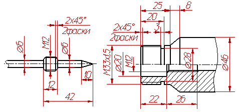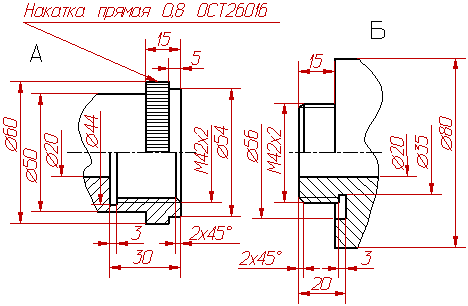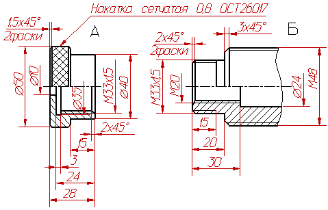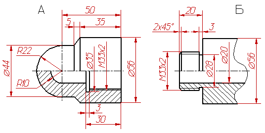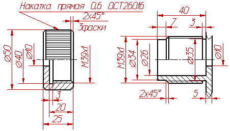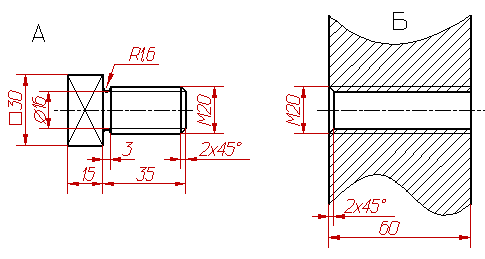 Рисунок 38 Рисунок 39 Дано: изображения детали А и детали Б. Задание: 1. Начертить резьбовое соединение двух деталей. Желательно показать резьбовое соединение в таком положении, когда стержень ввинчен в отверстие примерно на 10-15 мм длины резьбы. 2. Показать размер общей резьбы.
