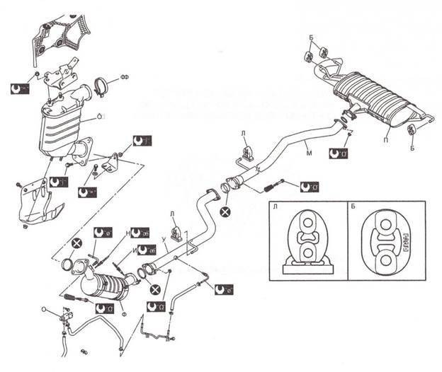 Вот система выпуска нашего авто. Под буквой Ф это сажевый фильтр. Под буквой О это датчик дифдавления. С начала картинка самого датчика дифдавления. Под буквой У те самые резиновые трубки которые надо проверить. Чаще прогорает та которая тоньше. Прогорает прямо у входа в сажевый.