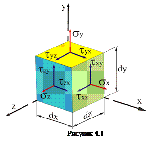 Если мысленно вырезать вокруг какой-нибудь точки тела элемент в виде бесконечного малого кубика, то по его граням в общем случае будут действовать напряжения, представленные на рис. 4.1.