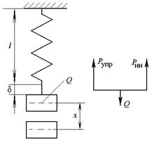 При составлении уравнения движения будем исходить из принципа Даламбера, который заключается в том, что к движущейся с ускорением системе применимы соотношения статики при условии, что в число внешних сил включена фиктивная сила инерции, равная произведению массы на ускорение и направленная против ускорения. Полагаем, что скорость dx / dt и ускорение d 2 x / dt 2 совпадают по направлению с отклонением X. При отклонении груза возникает упругая сила Р упр которая стремится вернуть груз в состояние равновесия и потому называется восстанавливающей силой. Дифференциальное уравнение колебаний получим, спроектировав все действующие силы на вертикальную ось: