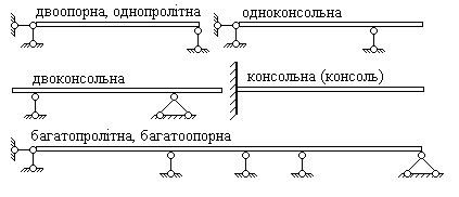 Рис.6.2. У шарнірно-рухомій опорі (рис.6.2а) виникає одна реактивна сила R, що діє перпендикулярно поверхні опори (у напрямку показаного зв'язку). У шарнірно-нерухомій опорі (рис.6.2б) виникають дві складових реакції: вертикальна R і горизонтальна H. У затисненні (жорсткому затисненні) (рис.6.2в), виникають три складових: вертикальна R, горизонтальна H і момент M. Для кінематичної незмінюваності плоских балок необхідна кількість зовнішніх зв'язків три, причому при плоскому згинанні горизонтальна складова H реакції в шарнірно-нерухомій опорі тотожно дорівнює нулю. Тому надалі використовуємо два рівняння рівноваги. Якщо кількість зовнішніх поперечних зв'язків більше двох, то така балка називається статично невизначеною (багатоопорною). Типи і найменування балок, що зустрічаються, показані на рис.6.3.