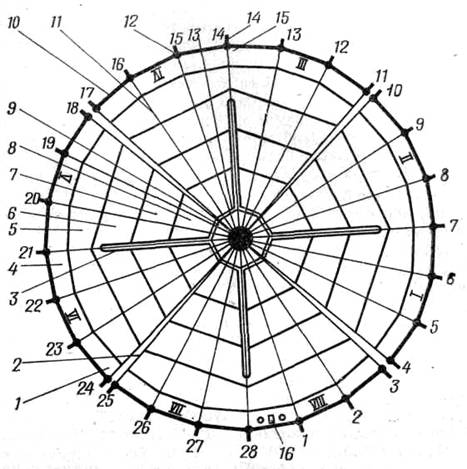 Рис. 8. Купол парашюта С-5К: 1─ сектор; 2 ─ сквозные, щели; 3 ─ щели; 4 ─ полотнище сектора; 5 ─ I клин сектора; 6 ─ II клин сектора; 7 ─ Ш клин сектора; 8─ IV клин сектора; 9 ─ V клин сектора; 10 ─ нижняя кромка купола; 11 ─ радиальный каркас; 12 ─ петли; 13 ─ усиление; 14 ─ стропа; 15 ─ метка; 16 ─ заводское клеймо