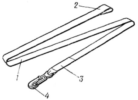 Рис. 34. Звено вытяжное: 1 ─ лента; 2 ─ петля; 3 ─муфта сигнальная; 4 ─ карабин прицепной