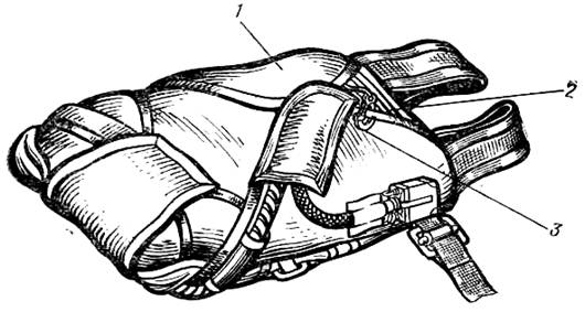 Рис, 49. Вид уложенной парашютной системы ПО-17: 1─ ранец; 3 ─ вытяжное звено; 3 ─ карабин