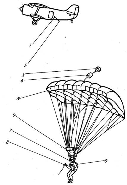 основного парашюта; 1 ─ звено вытяжное; 2 ─ фал гибкой шпильки; 3 ─ парашют вытяжной; 4 ─ чехол; 5 ─ купол парашюта; 6 ─ устройство рифления; 7 ─ подвесная система; 8 ─ звено ручного раскрытия; 9 ─ ранец.