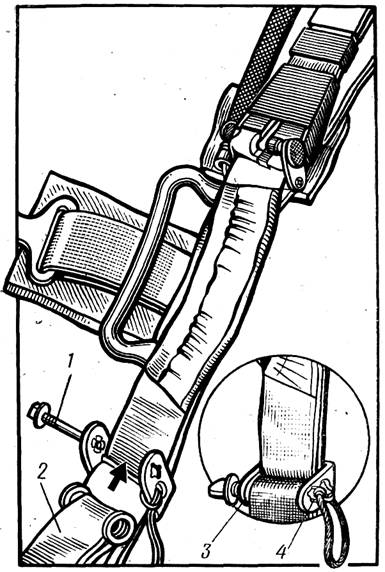 Рис. 74. Крепление запасного парашюта 3-5 к подвесной системе основного парашюта: 1 ─ палец; 2 ─ промежуточная подвесная система; 3 ─ скоба крепления; 4 ─ фиксатор скобы