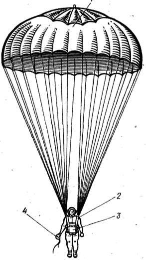 Рис. 78. Общий вид парашюта ПЗ-74: 1 ─ купол; 2 ─ промежуточная подвесная система; 3 ─ ранец; 4 ─вытяжное кольцо
