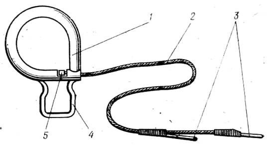 Рис. 79. Кольцо вытяжное ПЗ-74: 1 ─ кольцо; 2 ─ трос; 3 ─ шпильки; 4 ─ скоба; 5 ─ ограничитель
