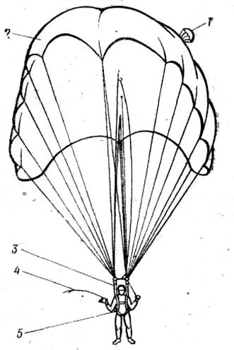 Рис. 80. Вид раскрытого парашюта ПЗ-81: 1─ парашют вытяжной; 2 ─ купол 27 м²; 3 ─ система подвесная промежуточная; 5 ─ ранец; 4 ─ звено ручного раскрытия