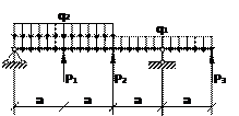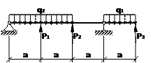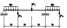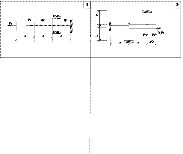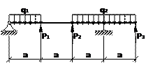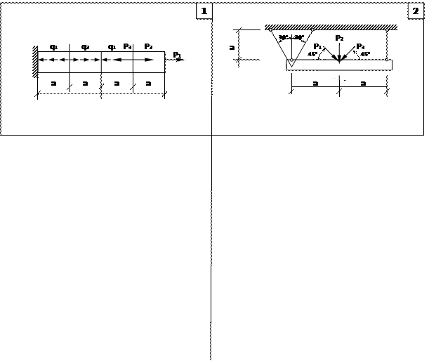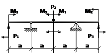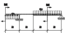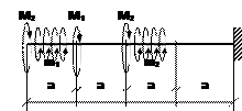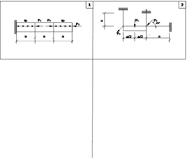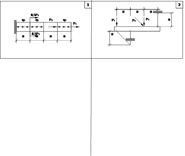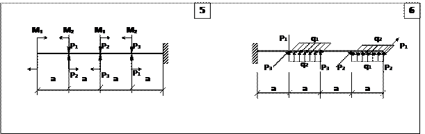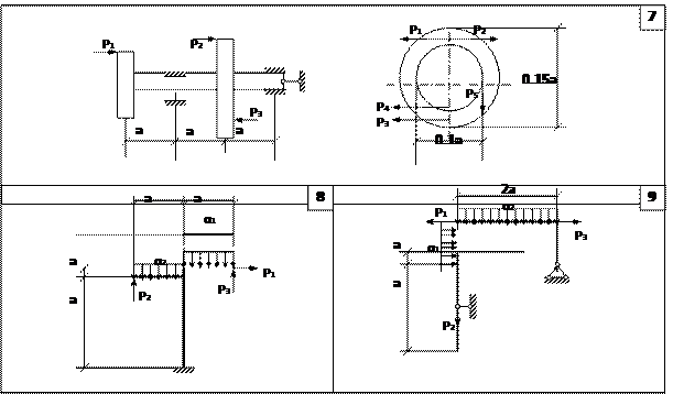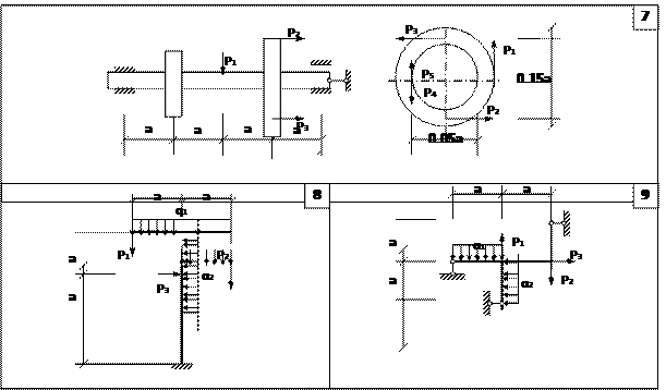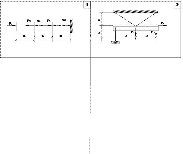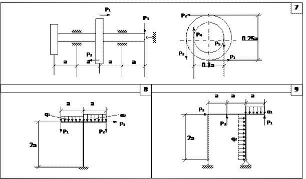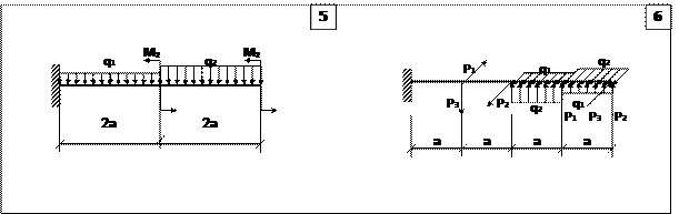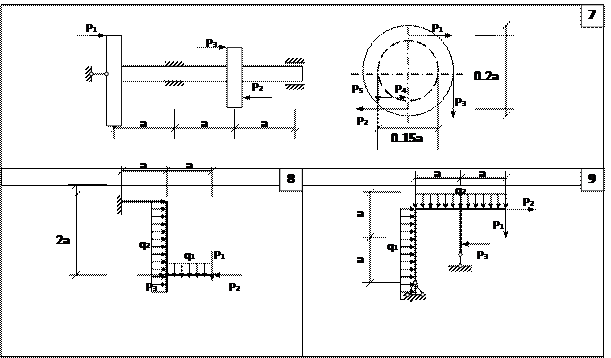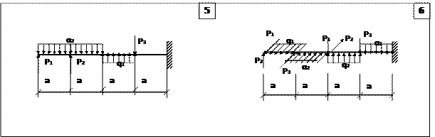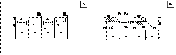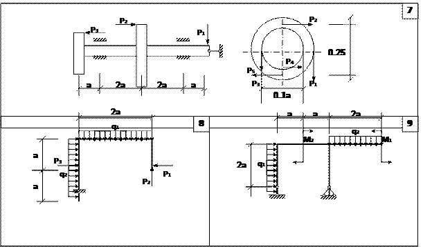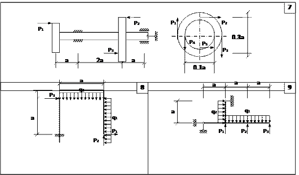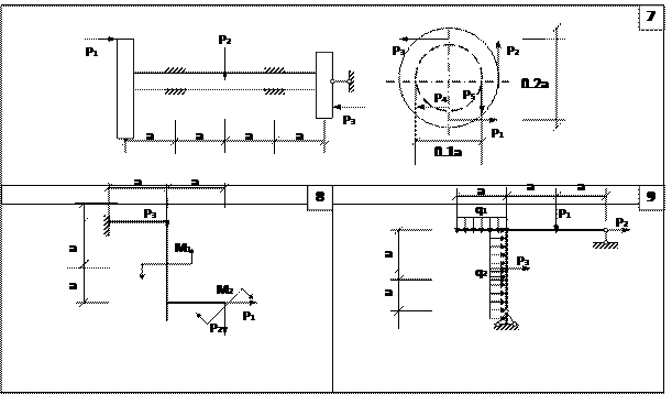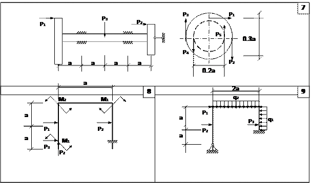 Рис.10 выбрать из табл. 1 значения нагрузок, которые находятся в пересечении строки и столбца. Находим: схема на рис. 2, М1 = 3М, М2 = 0, m1 = m, m2 = 0, Р2 = 3Р, Р1 = Р3 = 0, Р5 , q1 = 2q, q2 = 0. При построении эпюр принять следующие соотношения между нагрузками и длиной а: m = Р = q а, М = q а 2; силы Р4, Р5 определяются из условий равновесия.