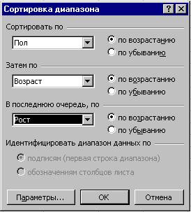 Пример Сортировка списка Одним из преимуществ списка является возможность изменять порядок записей по нескольким полям. Отсортировать заданный список по возрастанию значений трех полей: Пол, Возраст, Рост. 1. Выделите ячейку в списке. 2. Выберите команду Данные | Сортировка MS Excel отобразит диалоговое окно Сортировка диапазона.