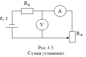 В данной установке используются источник постоянного тока (0 ¸ 7В), два мультиметра, один в режиме вольтметра, другой в режиме амперметра; нагрузкой является магазин сопротивлений. Для того, чтобы исключить возможность получения короткого замыкания подключают дополнительное сопротивление RД, выбирая одно из сопротивлений моста. Порядок выполнения работы 1. Собираем схему по рис.4. 3. 2. С помощью вольтметра устанавливают напряжение порядка 3¸5В (постоянный ток), на источнике питания 0¸7В. 3. Устанавливают на магазине сопротивление, порядка 10 кОм (используя только один тумблер переключения на магазине, около которого стоит множитель х103). 4. Понижая сопротивление нагрузки на 1кОм, замеряют значения тока и напряжения на ней. 5. Результаты измерений представляют в виде таблицы, в которой должно быть не менее 11 значений.