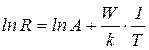 где А – константа, зависящая от размеров полупроводника и концентрации валентных электронов; k = 1,38 . 10-23 Дж/К = 0,87 . 10-4 эВ/К – постоянная Больцмана; Т - температура по шкале Кельвина; W - энергия активации в электрон – вольтах (эВ). Из зависимости R(T), используя формулу (5.3), можно определить энергию активации. Для этого прологарифмируем формулу (5.3):