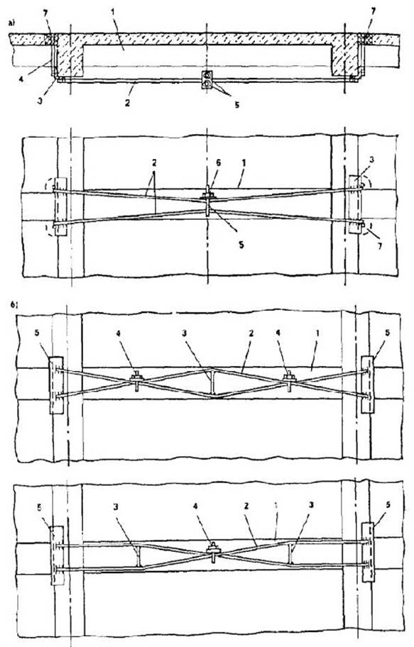Схемы В отдельную группу усиления дополнительной арматурой могут быть объединены и рекомендованы к применению затяжки, напрягаемые посредством взаимного стягивания двух или четырех стержней специальными стяжными болтами (см. рис. 1). Стяжные болты должны иметь вид хомута с двумя нарезными концами и общей шайбой. Натяжение производится одновременным подтягиванием гаек на обоих концах этого хомута. Натяжение посредством взаимного стягивания характеризуется простотой и не требует значительных усилий, поскольку напряжения в стяжных болтах (хомутах) в 7...10 раз меньше напряжений в стягиваемых дополнительных стержнях. Данный способ позволяет создать во всех стягиваемых стержнях (двух или четырех) равномерные усилия, т.е. обеспечивает их саморегулирование. Стягивание может производиться одним стяжным болтом или двумя, с промежуточными распорками или без них. Вертикальные стержни анкеров-затяжек пропускаются через просверленные в перекрытии отверстия для анкеровки.