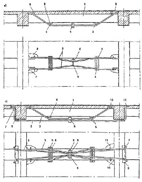 Рис. 15. Усиление балки дополнительной предварительно напряженной арматурой: а - горизонтальными затяжками: 1 - усиливаемая балка; 2 - горизонтальные затяжки; 3 - уголок анкера; 4 - вертикальные стержни анкера; 5 - натяжной болт; 6 - шайба; 7 - отверстие, заделываемое после установки анкера; б - промежуточными распорками: 1 - усиливаемая балка; 2 - затяжки; 3 - промежуточные распорки; 4 - натяжной болт; 5 - анкерное устройство; в - шпренгельными затяжками: 1 - усиливаемая балка; 2 - шпренгельные затяжки; 3 - подкладка; 4 - коротыш; 5 - натяжной болт; 6 - шайба; 7 - швеллер анкера; 8 - отверстие, заделываемое после установки анкера; г - комбинированными затяжками: 1 - усиливаемая балка; 2 - горизонтальные затяжки; 3 - шпренгельные затяжки; 4 - подкладка; 5 - коротыши; 6 - уголок анкера горизонтальных затяжек; 7 - вертикальные анкерные стержни; 8 - натяжной болт; 9 - шайба; 10 - швеллер анкера шпренгельных затяжек; 11 - отверстие, заделываемое после установки анкера