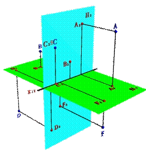 Убираем проецирующие лучи из точек А, В, С, D и F наплоскости П1 и П2.